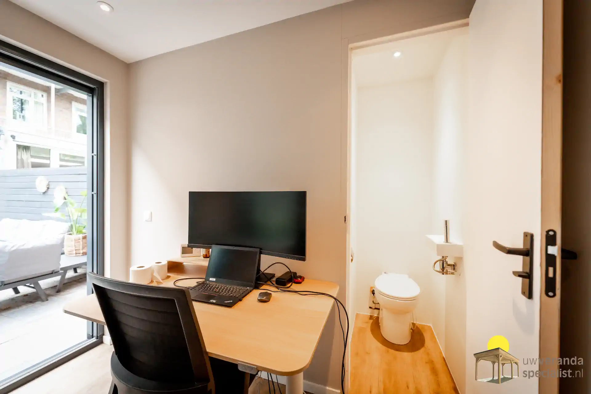 Onze geïsoleerde tuinkantoren worden standaard uitgerust met elektra en ventilatie. Optioneel kun je kiezen voor verwarming, airco, een extra berging, of zelfs een klein toilet, zodat je helemaal zelfstandig kunt werken. Dankzij de uitstekende isolatie en ventilatie blijft het binnen droog en stil. Dat maakt werken, ook tijdens lange werkdagen, uiterst comfortabel.